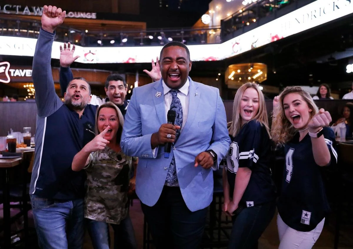 Alumnus Dillian Frelow poses with Cowboys fans Nov. 4 at Texas Live. Frelow, former Mr. UTA and Homecoming king, works at Texas Live as a host.